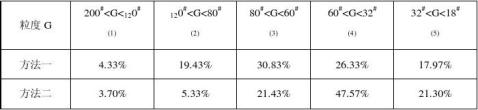 對顆粒粒度分布情況的數據和圖表進行分析比較,可以看出方法二顆粒粗細比較均勻,基本上接近于正態分布,較為理想,60#<G<32#的顆粒 由方法一的26.33%提高到47.57%,而120<G<80的顆粒由