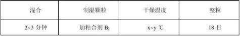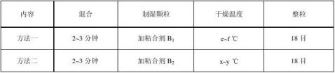 方法一:內加輔料A,粘合劑B1 ,外加1%的輔料C 高速攪拌制粒,沸騰器干燥。 方法二:內加輔料A,粘合劑B2 ,外加2%的輔料C 高速攪拌制粒,沸騰器干燥。 1. 處方組成,1000片用量見表1