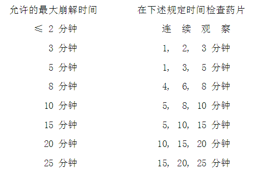 崩解儀的6個管子中,按下列時間表檢查崩解情況。