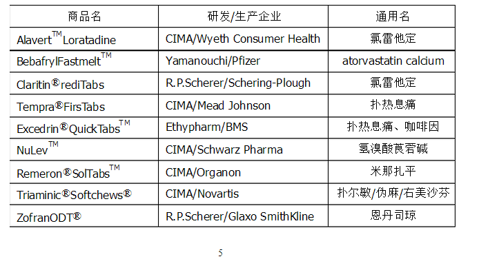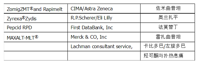 從上表品種可以看出,對口崩片藥物的選擇但并無特殊的限制,主要考慮適合的人群的需求及相應的疾病需要,并根據生產工藝、特定技術、病人的依從性等方面考慮藥物及藥物的劑量。例如采用冷凍干燥技術時,因為過多的水溶性藥物可能引起凍干品的低共熔現象,而不能實現水分的凍干,得到的制品板結,故所能包含的水溶性藥物的劑量要比水不溶性藥物的劑量低。另外,過多的藥物量可能產生掩蔽不良嗅味或苦味的實際困難。對口腔粘膜有強烈剌激性的藥物也不宜制備成口崩片。