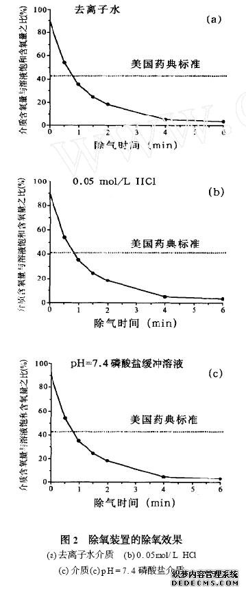 磷酸鹽緩沖溶液(pH = 7. 4) 。將三種介質分別放入溶解裝置, 然后通入氦氣, 在37 ℃、攪拌漿轉速100rpm 條件下,通氣6min。除氧裝置的除氧效果如圖2 所示。這種方法適用于各類介質,氦氣使用量很低,只要1min 就可達到美G藥典的要求,有望得到廣泛應用。