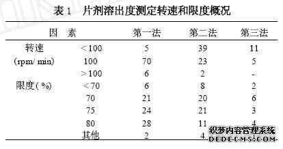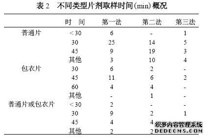 2. 2 藥物片劑或膠囊劑經口服后須經過崩解、溶解過程才能被機體吸收利用,溶出度測定較崩解時限檢查向吸收過程前進了一步,但仍然需要經過崩解過程。片劑根據其性狀的不同崩解時限規定有所區別,通常情況下普通片、薄膜衣片和糖衣片分別要求在15 ,30 和60 min 內全部崩解。從表2中可以看出在溶出度檢查取樣時間的選擇上片劑性狀的差異沒有得到充分體現,普通片45 min 及其以上時間取樣的約占45 % ,在普通片和包衣片并存時,只有鹽酸四環素片規定僅糖衣片檢查溶出度和鹽酸肼屈嗪片規定普通片30 分鐘、糖衣片60 min 取樣外,其余的都沒有加以區分。藥典規定檢查溶出度的制劑不再進行崩解時限的檢查,在藥物的質量控制中兩者之間存在一定的聯系,雖然溶出度測定在一定程度上取決于藥物的溶解性能,但如何體現劑型的特點也應有所考慮。另外,鹽酸地爾硫芏卓片、格列齊特片和頭孢呋辛酯片及其膠囊采用了兩點取樣,規定了各自的限度要求,使溶出的速度和程度得到了充分體現,其方法值得借鑒。